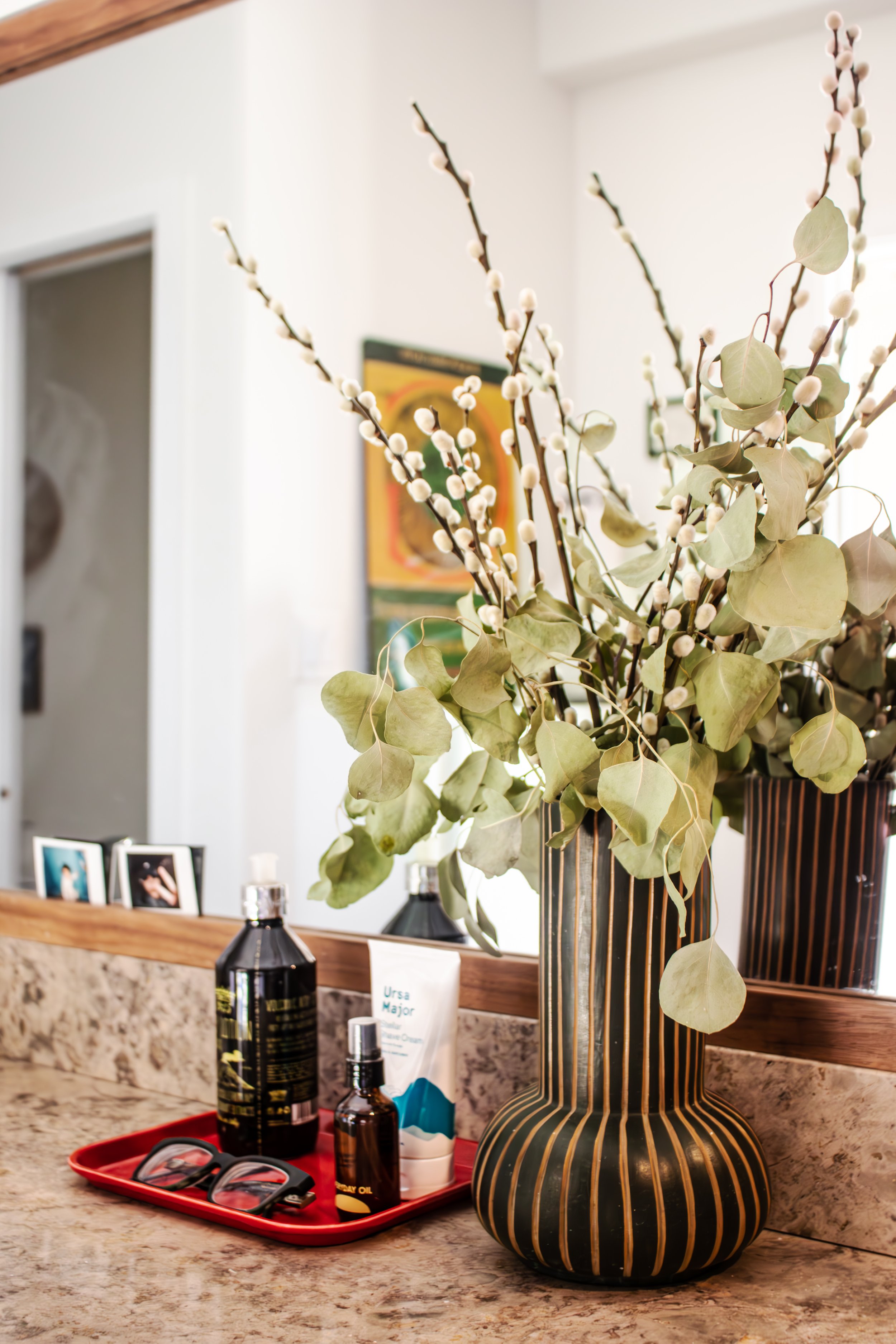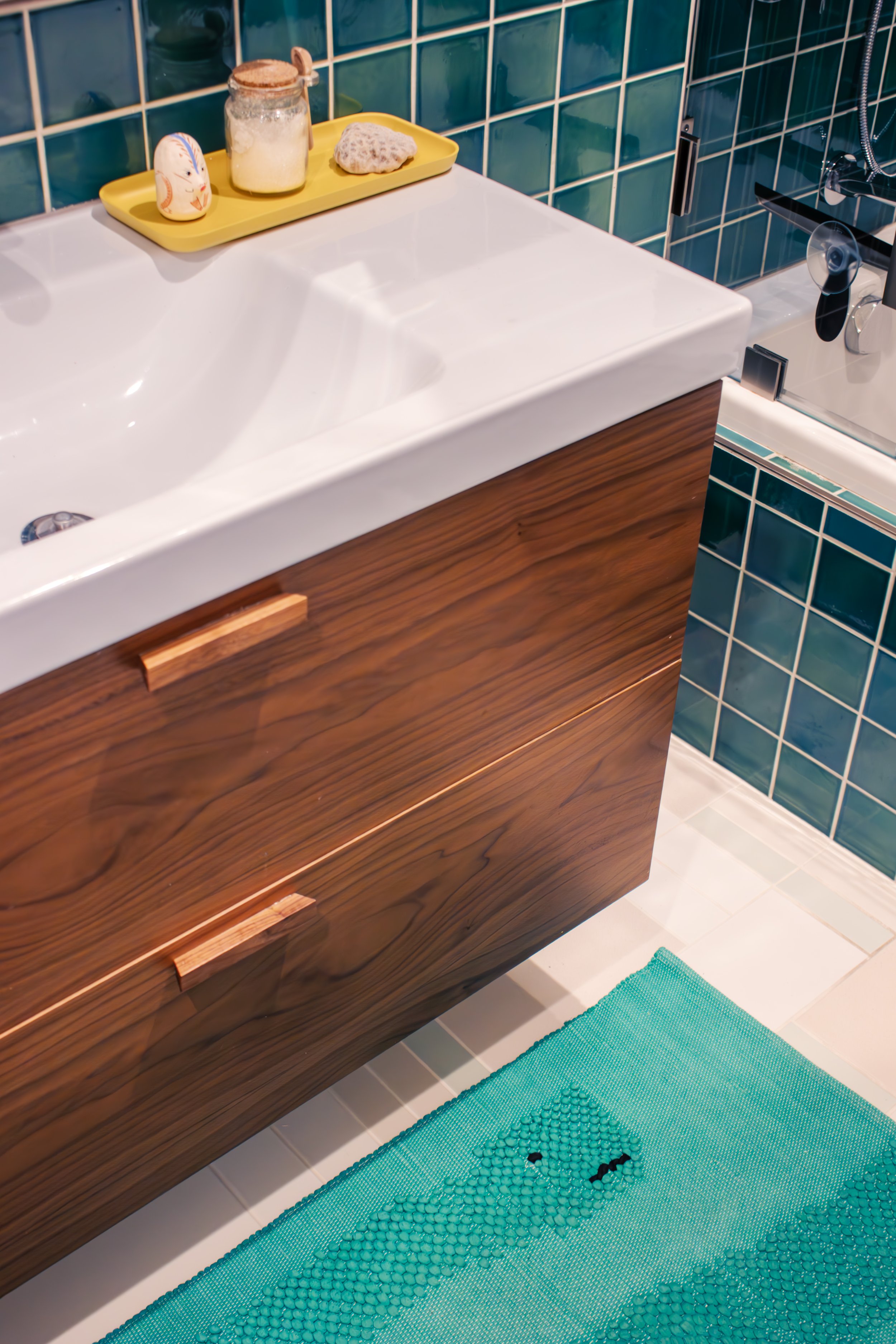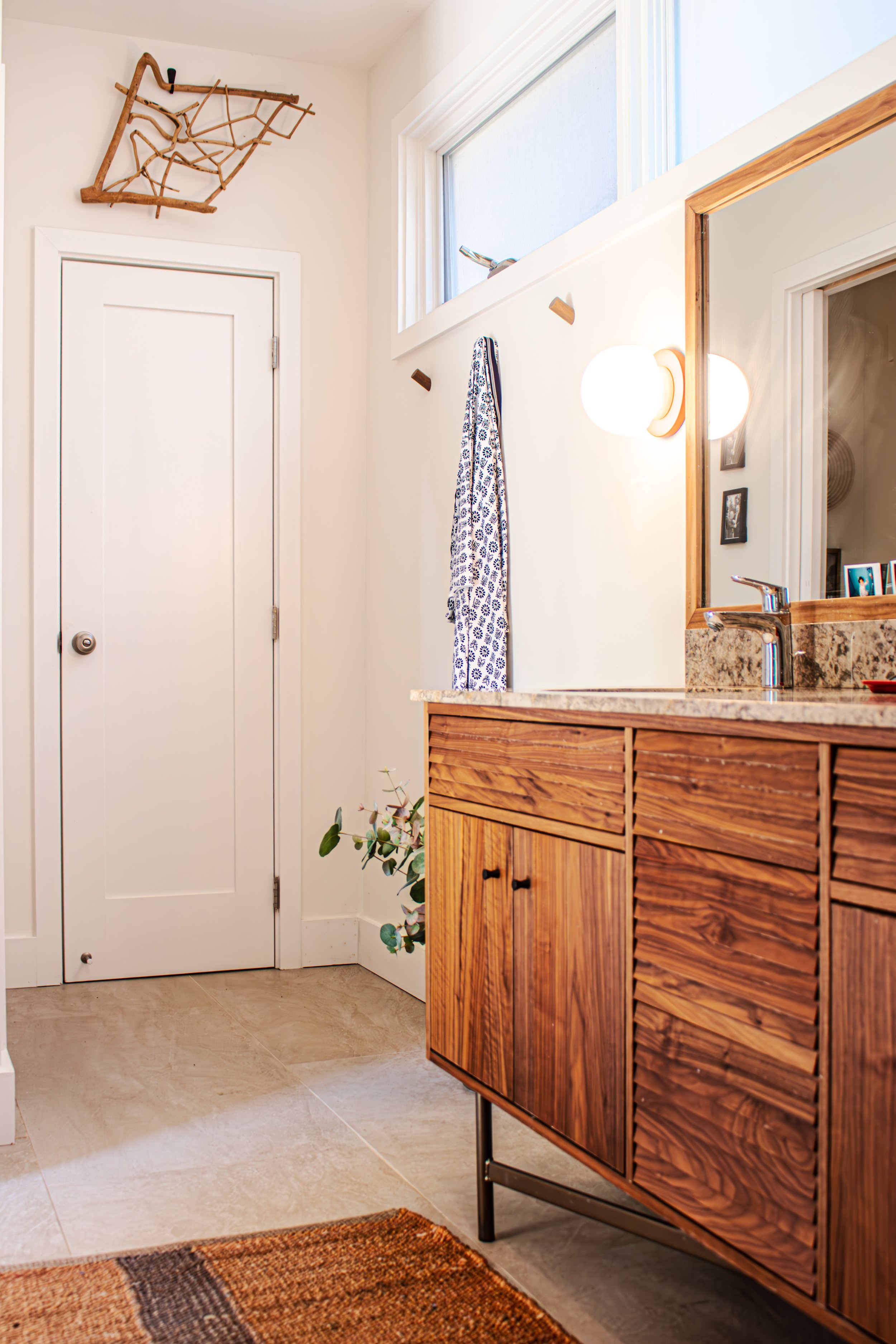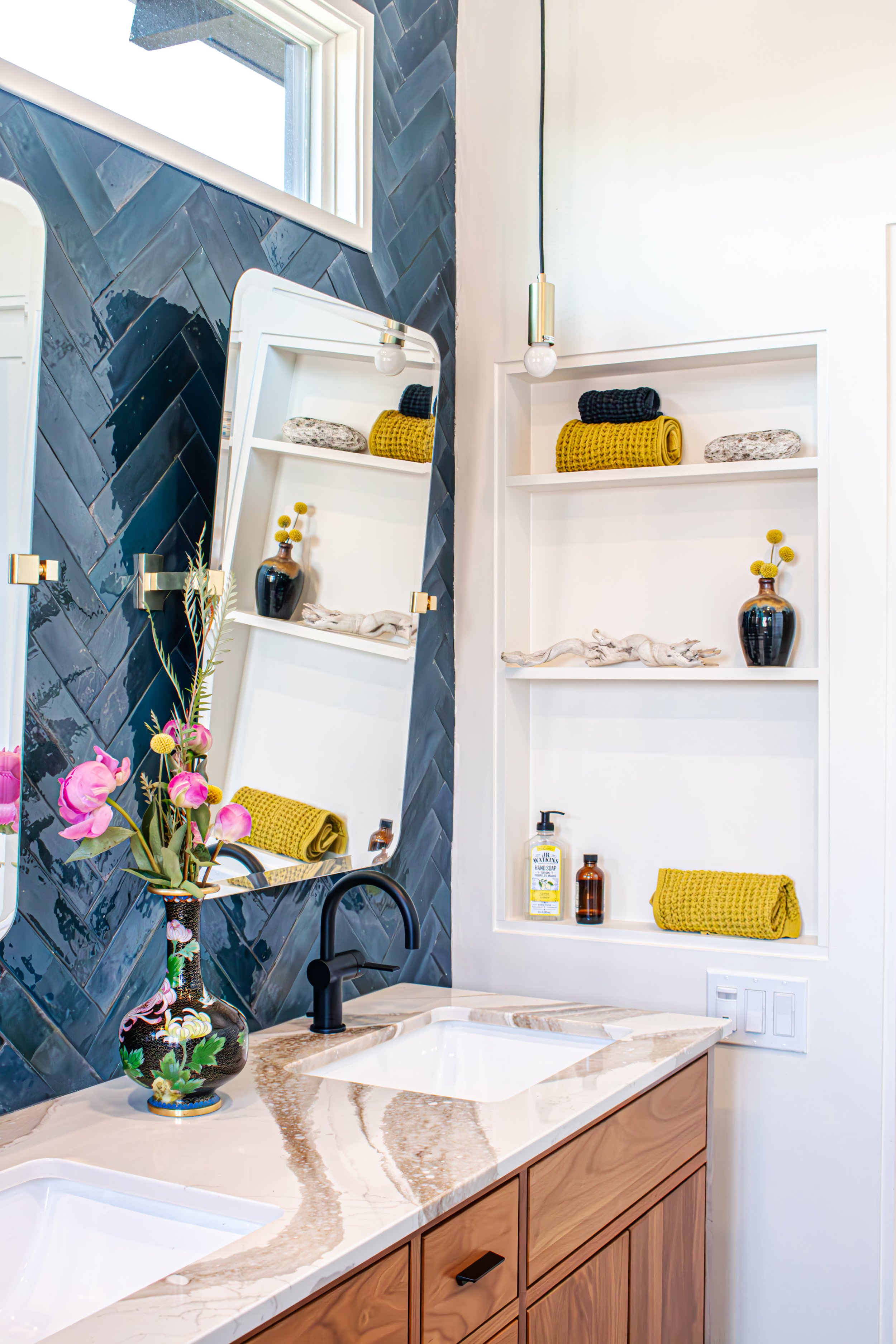 Two IKEA Ivar pine cabinets painted, resined, and mounted on the wall create fun and ample storage. Tile: Heath Overstock Shed Construction: Hyperion Design and Build