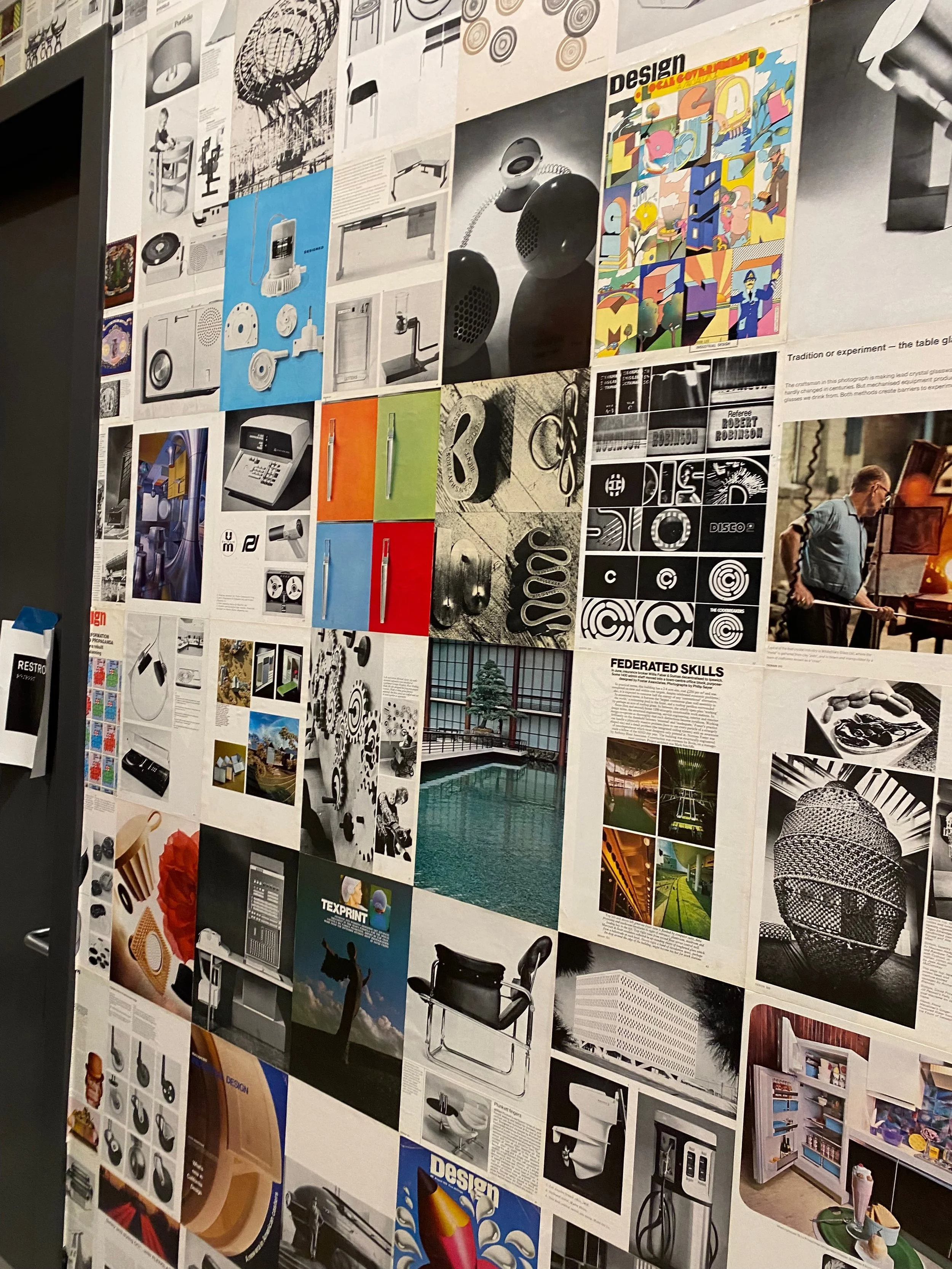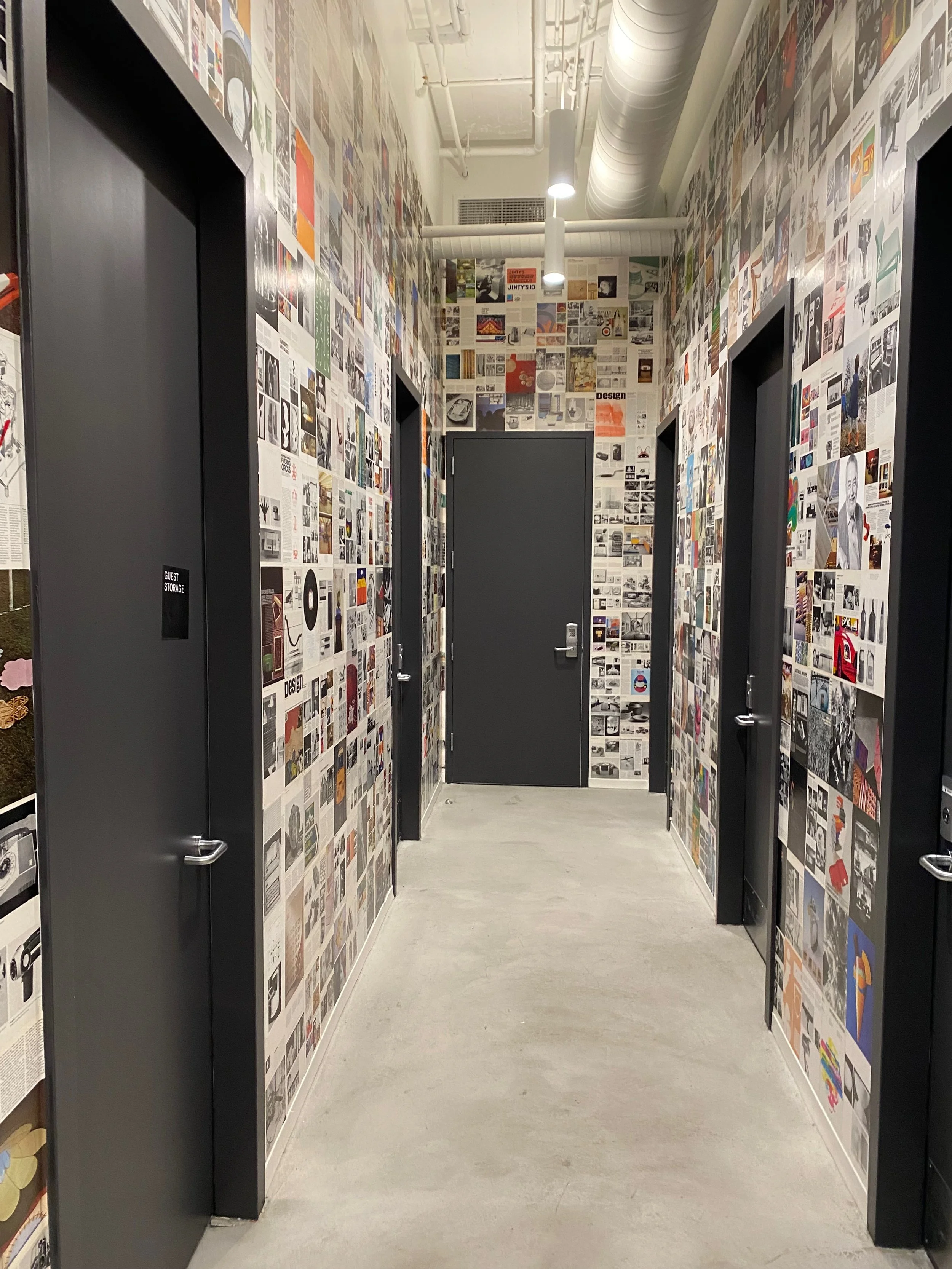 Boxes of vintage design magazines belonging to the company’s cofounder were repurposed to create an immersive, custom wallcovering.