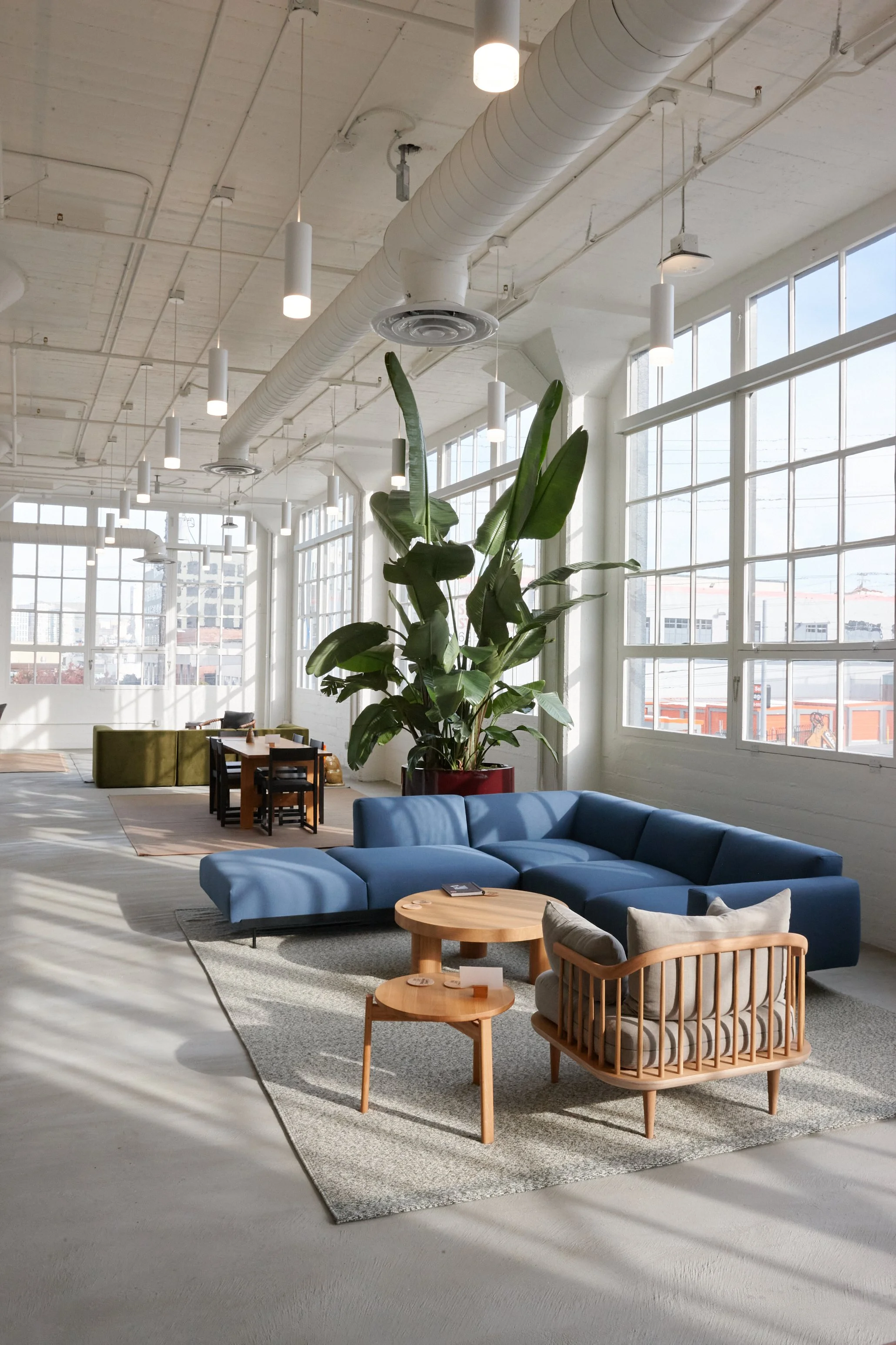 With the plants, we went big and bold. Given the soaring ceilings, vast spaces, and loads of concrete, we chose huge, sculptural plants that would be aesthetically impactful, while helping with visual zoning and acoustics.